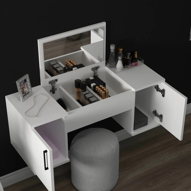 میز آرایش مدل 671 جنس روکش از ملامینه میباشد و دارای دو درب و یک باکس با لولای آرام بند با کیفیت و این کالا از استحکام و مقاومت بالایی برخوردار است و در رنگ بندی های زیبا و شکیل میباشد. (((((( کالای ارسالی دارای صندلی و آیینه نمیباشد))))))