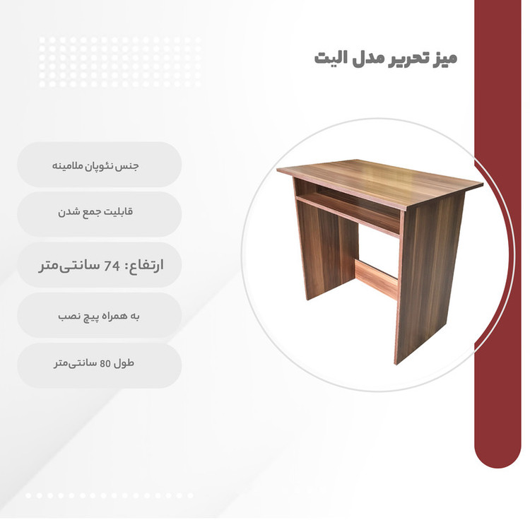 «میز تحریر مدل الیت» از نئوپان ساخته شده و دارای روکش ملامینه است که از خطخوردگی و آسیب به میز هنگام استفاده از وسایل تیزی مثل پرگار و مداد نوکی جلوگیری میکند. یکی از مزیت های این میز شکل مربعی و اندازه آن است که در هر جای خانه، حتی اتاقهای کوچک هم جای میگیرد و می تواند زینت بخش خانه باشد. شما میتوانید کتاب، لوازم تحریر، لپتاپ یا دیگر لوازم شخصی خود را در کشو و طبقه جاداری که در کنار آن تعبیه شده، قرار دهید. کتاب، لوازم تحریر، لپتاپ یا دیگر لوازم شخصی را میتوانید درطبقه جاداری که در آن تعبیه شده، قرار دهید. ابعاد میز 74 × 50 × 80 سانتیمتر است که میتوانید. برای حفظ زیبایی و نمای این میز، میخ و پیچها طوری نصب شدهاند که در معرض دید نباشند. این میز تحریر به وسیله پیچ های الیت مونتاژ می شود و قابلیت سرهم کردن و باز کردن چند باره را در منزل برای سهولت در جابجایی و اثاث کشی را دارد.